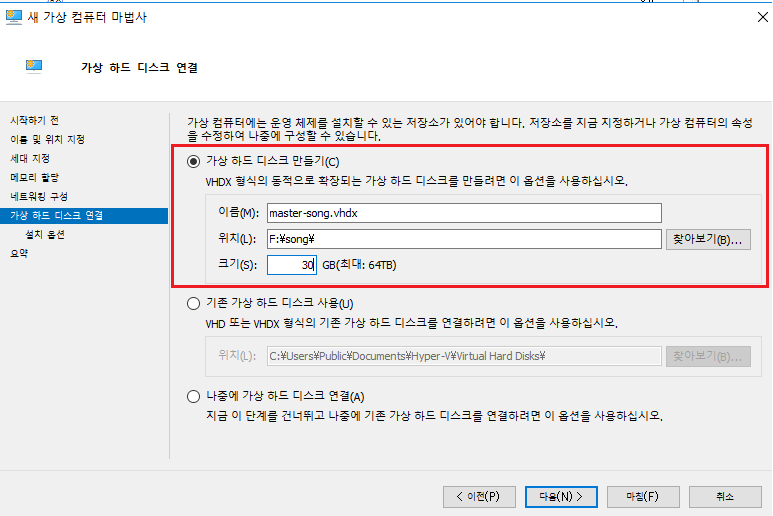 가상 하드디스크 연결 : 디스크의 위치를 지정해준다.