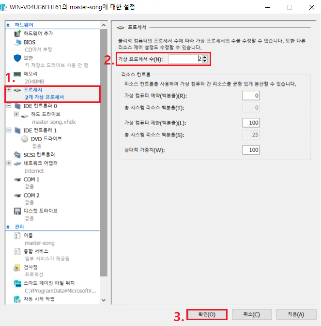 OS를 넣기 전에 CPU 코어수를 2개로 설정(최소사양임)