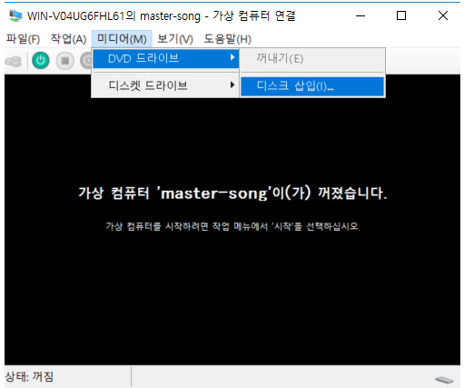 미디어 > DVD 드라이브 > 디스크 삽입 > centos 파일 지정
