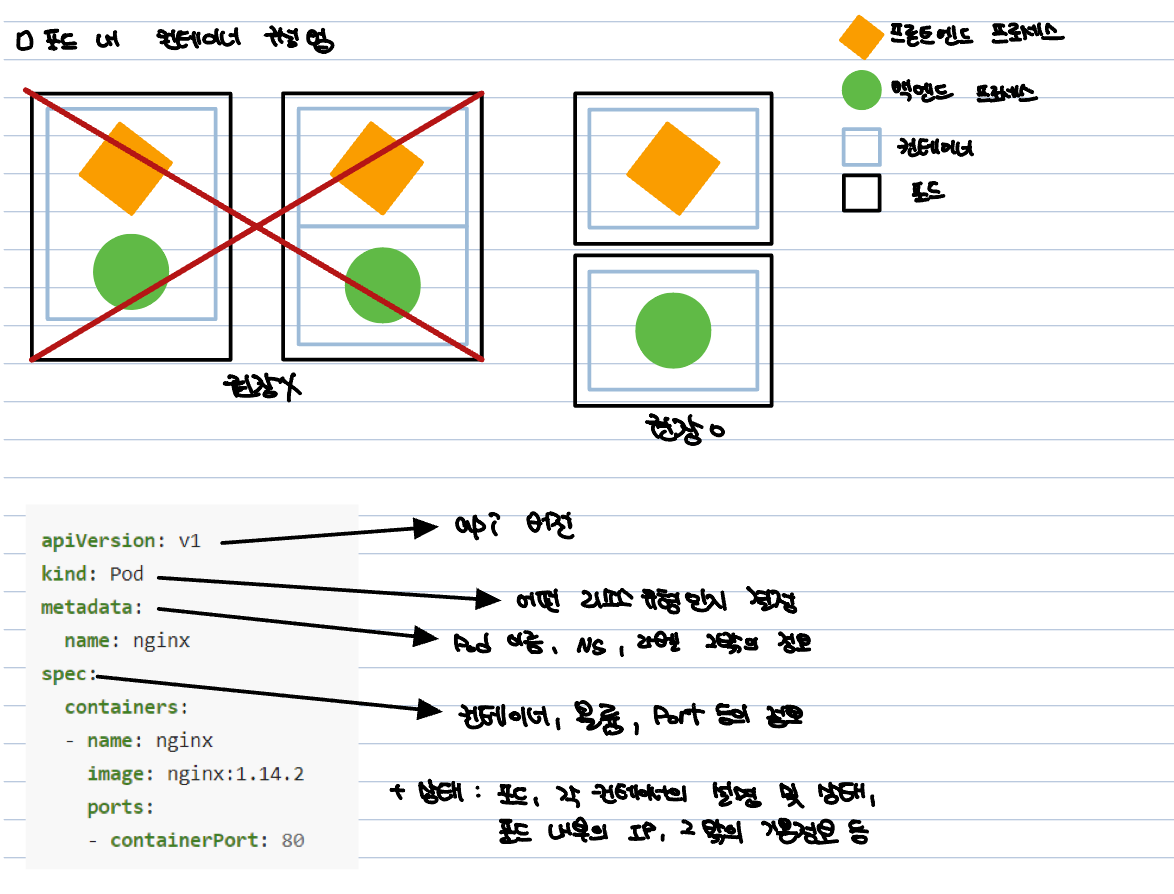 1 pod - 1 container (O) / but 이걸 권장하는 편: 여러 프로세스를 실행하기 위해서는 컨테이너당 단일 프로세스가 적합