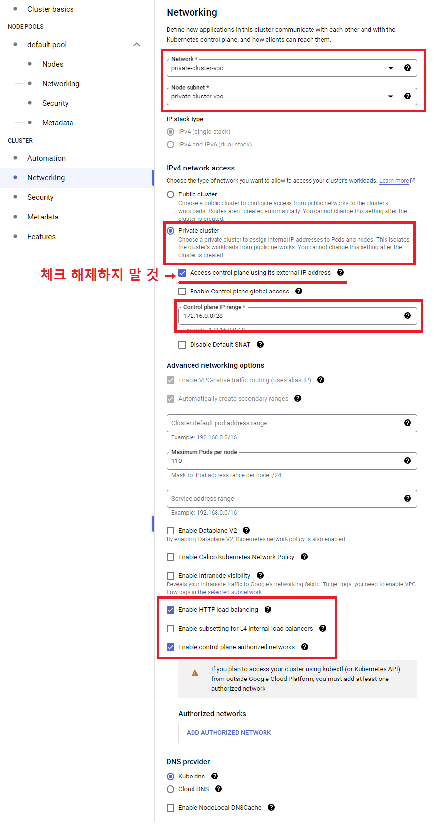 ※ access control plane using its external IP address : 체크해제 시 클러스터의 external ip 는 생성되지 않는다.