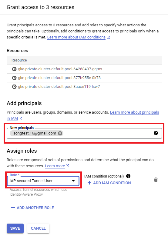 security > Identity-Aware Proxy > SSH and TCP resources > 리소스 체크 > + add principal