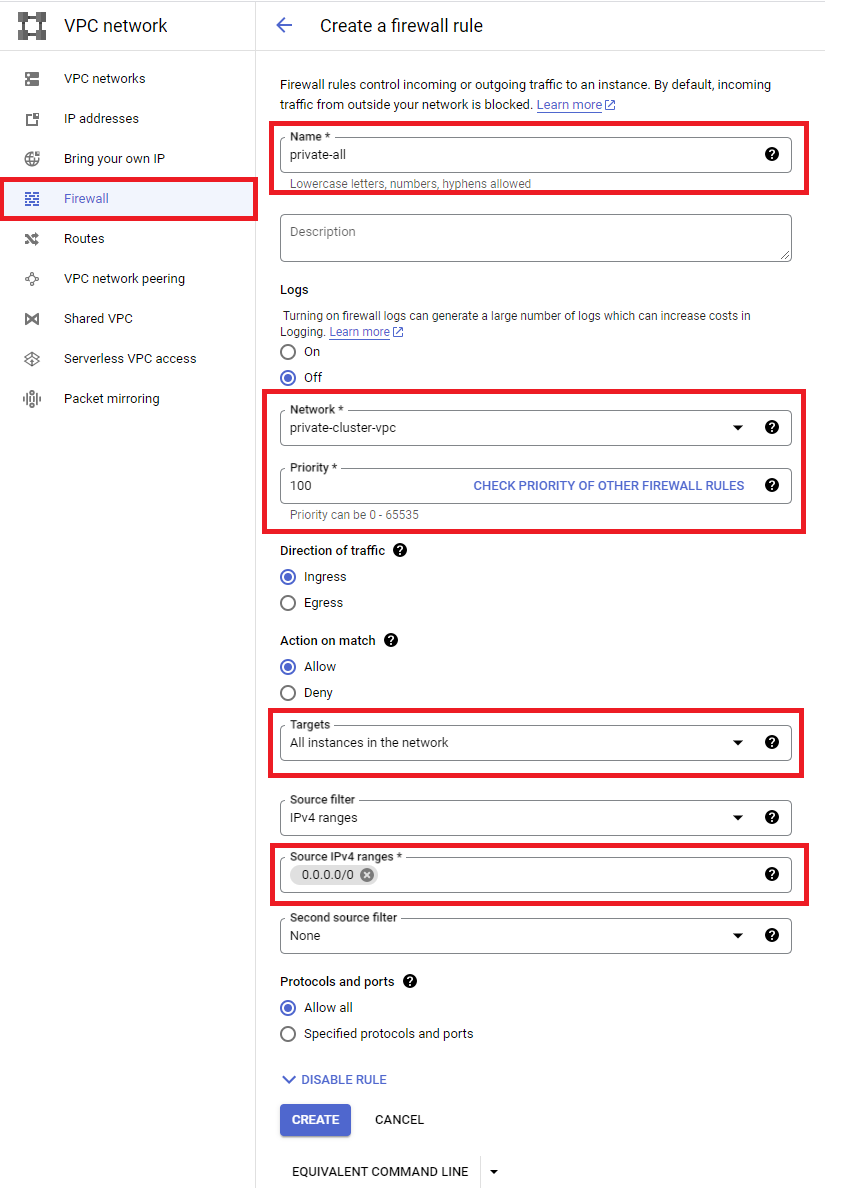 vpc network > firewall > create firewall rule > 세부설정(▼) > create