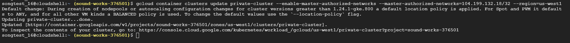 gcloud container clusters update private-cluster --enable-master-authorized-networks --master-authorized-networks=104.199.132.18/32 --region=us-west1