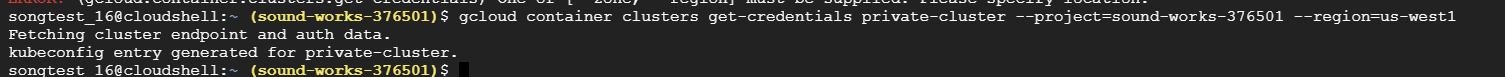gcloud container clusters get-credentials private-cluster --project=sound-works-376501 --region=us-west1