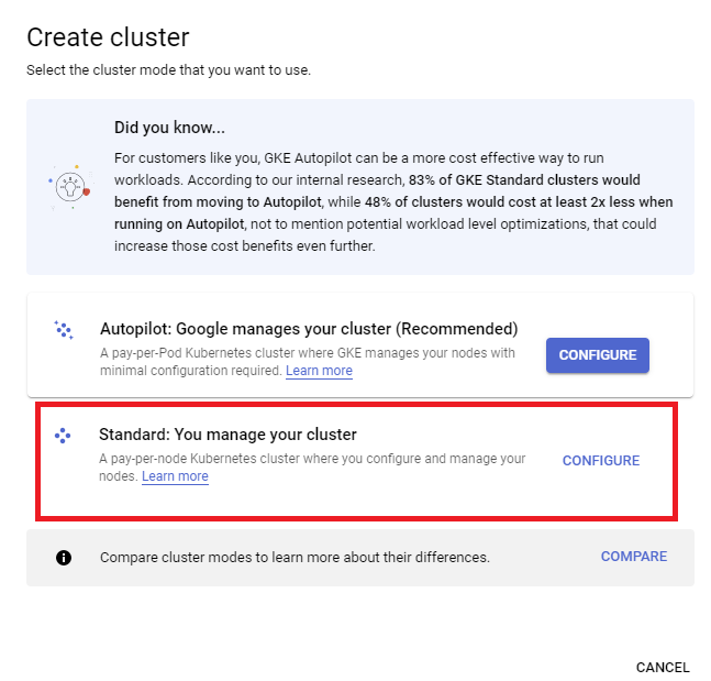 kubernetes engine > cluster > create > standard > configure > 세부설정(아래) > create