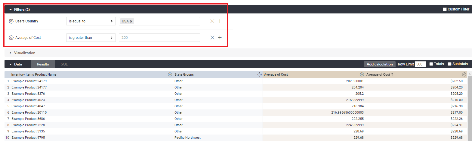 Average of Cost 필터 > is greater than : 200 > run