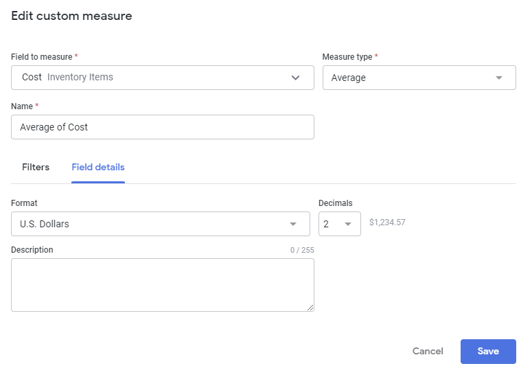 Custom Fields > +Add > Custom Measure