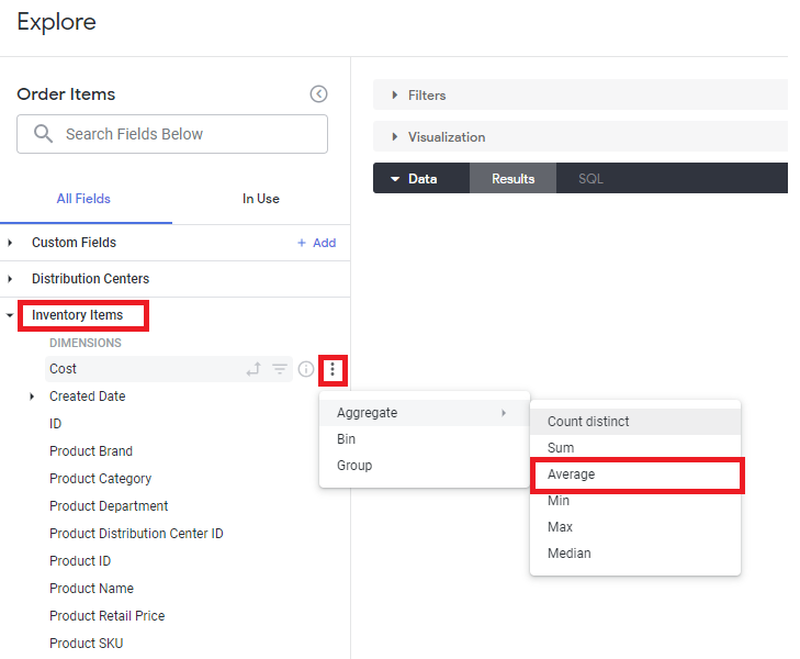 Inventory Items > Cost(dimension) > 점 세개 > Aggregate > Average