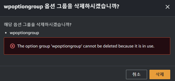 옵션 그룹을 지우려고 하면 스냅샷 때문에 지울 수 없다는 에러가 생김