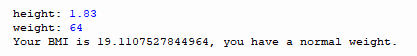 print(f"Your BMI is {bmi}, you have a normal weight.")