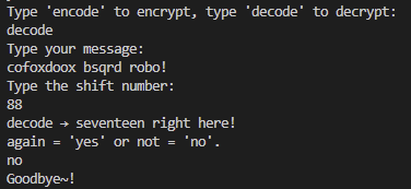 decrypt(entxt = text, desh = shift) # decrypt(entxt = vyw, desh = 3)