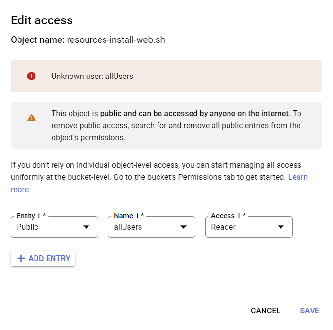 그럼 일단 bucket details > permissions > access control : uniform → fine-grained > save] 설정해 > edit access 가 됨 > add entry