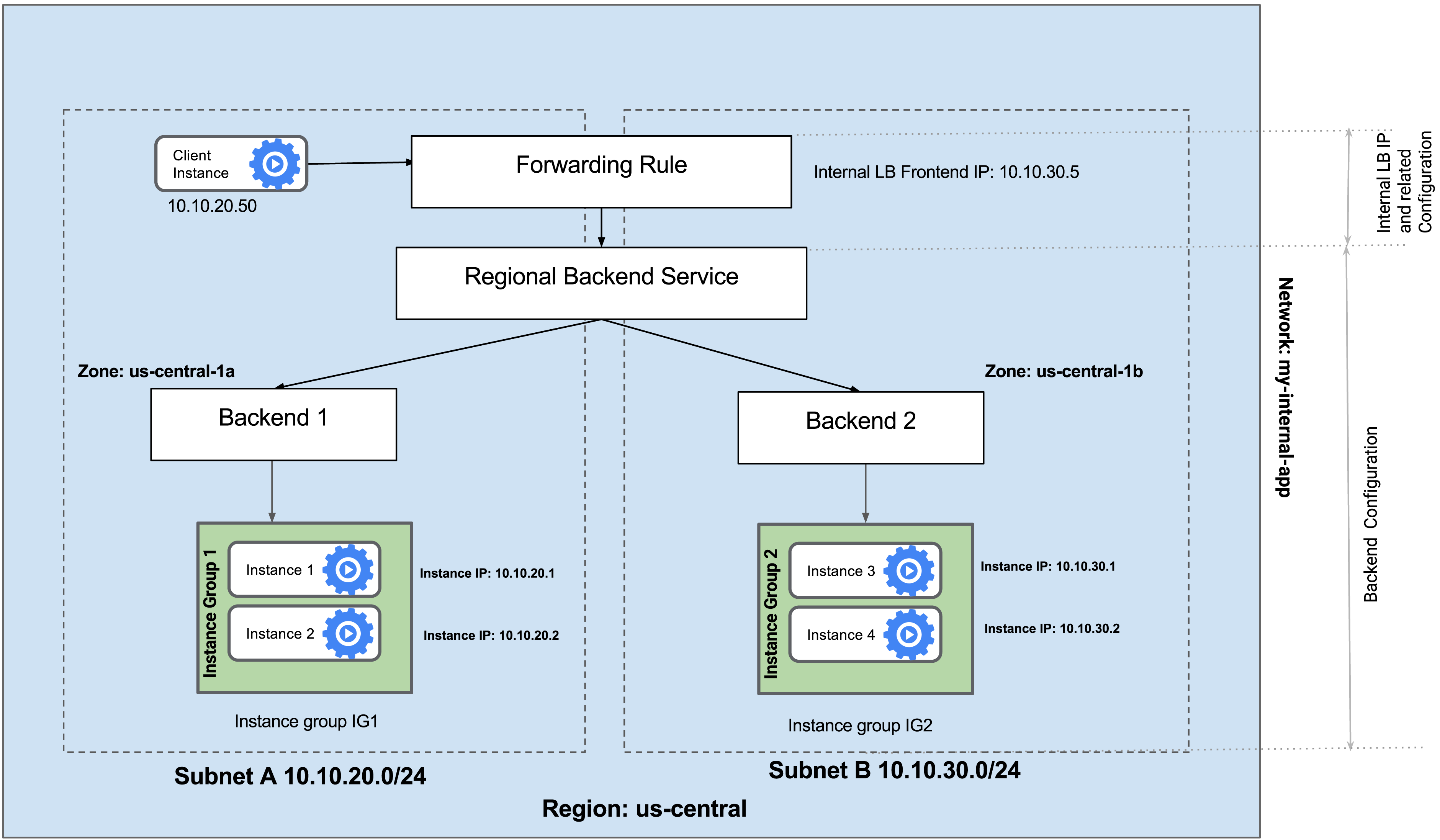 두 백엔드 간 트래픽을 분산하도록 내부 로드 밸런서를 구성함