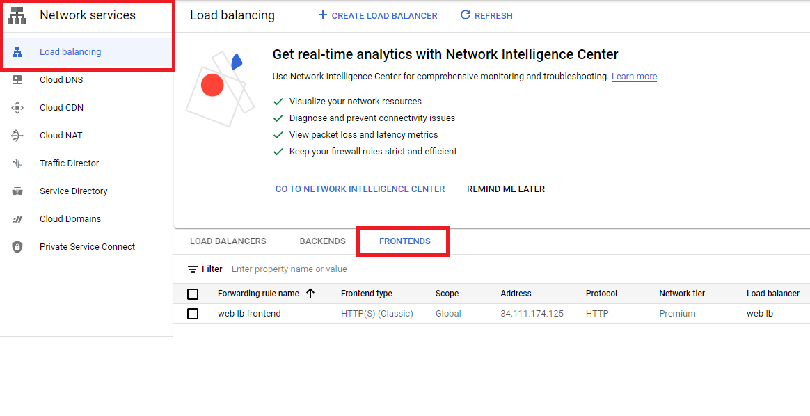 LB ip 확인은 network service > Load balancing > fronteds 를 확인하면 된다.