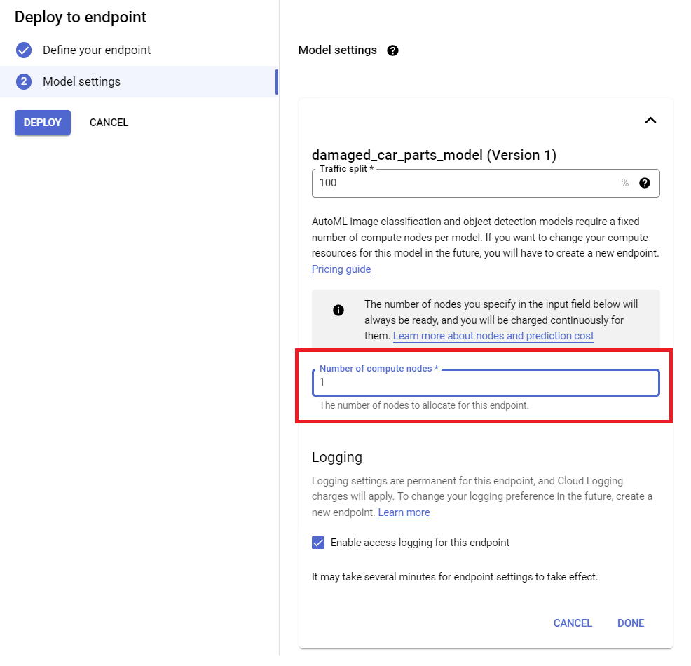 vertex ai > models > 방금 생성한 모델 클릭 > deploy&test > deploy to endpoint >