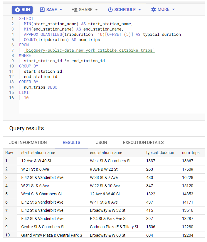 APPROX_QUANTILES(tripduration, 10)[OFFSET (5)] AS typical_duration,