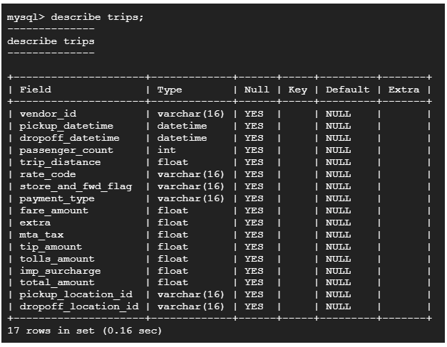 LINES TERMINATED BY '\n' IGNORE 1 LINES (vendor_id,pickup_datetime,dropoff_datetime,passenger_count,trip_distance,rate_code,store_and_fwd_flag,payment_type,fare_amount,extra,mta_tax,tip_amount,tolls_amount,imp_surcharge,total_amount,pickup_location_id,dropoff_location_id);