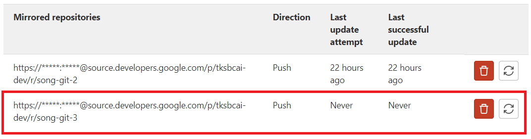 git → settings → repository → mirroring repositories를 연다 → 강제 동기화 해줌