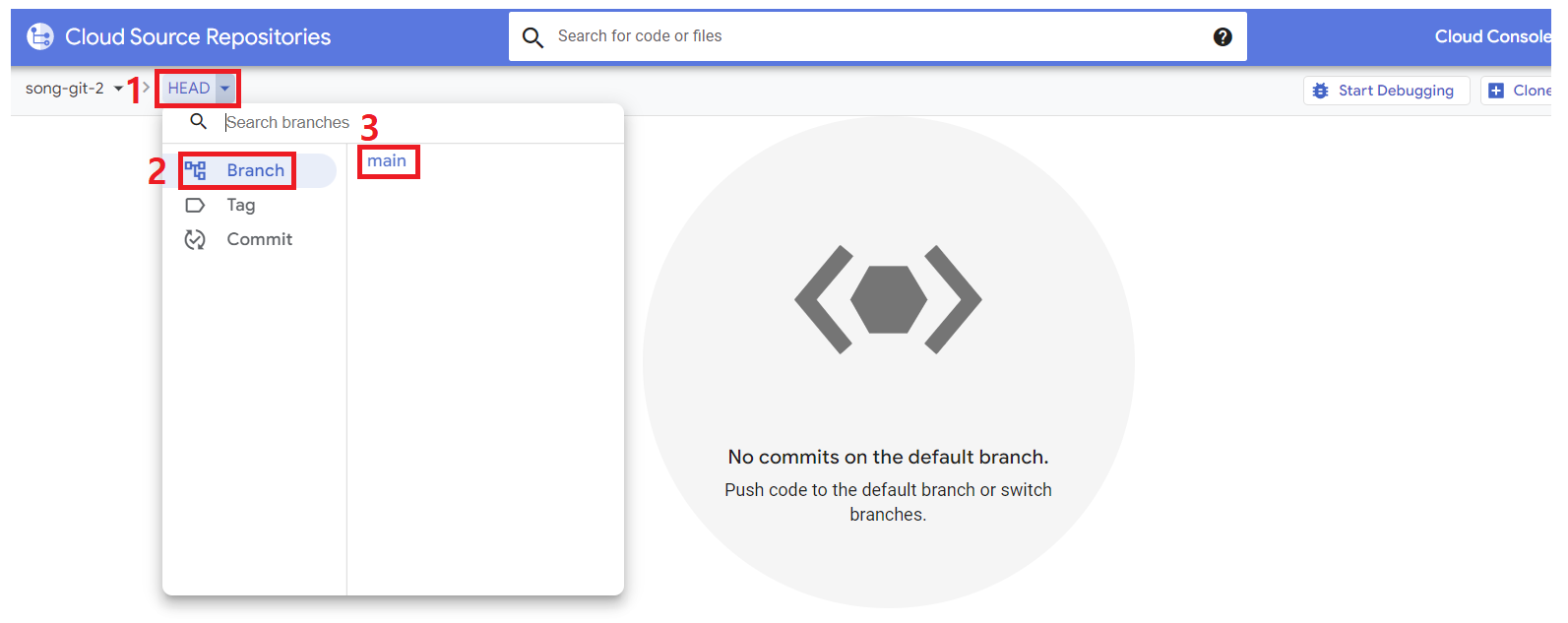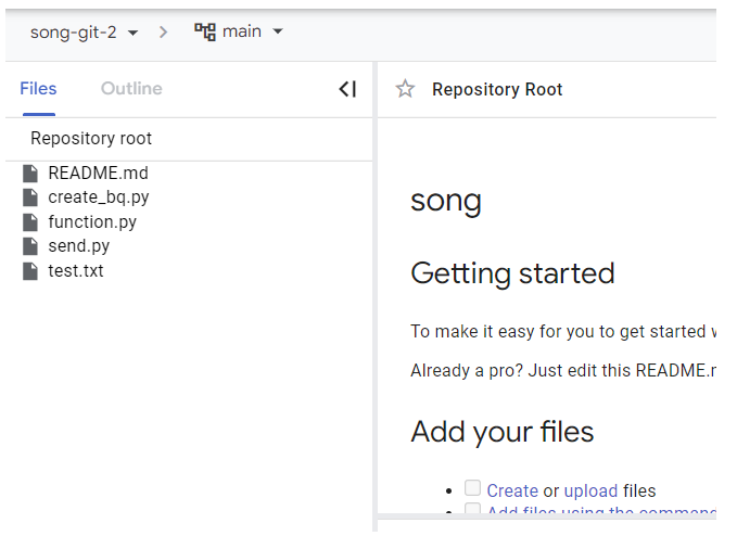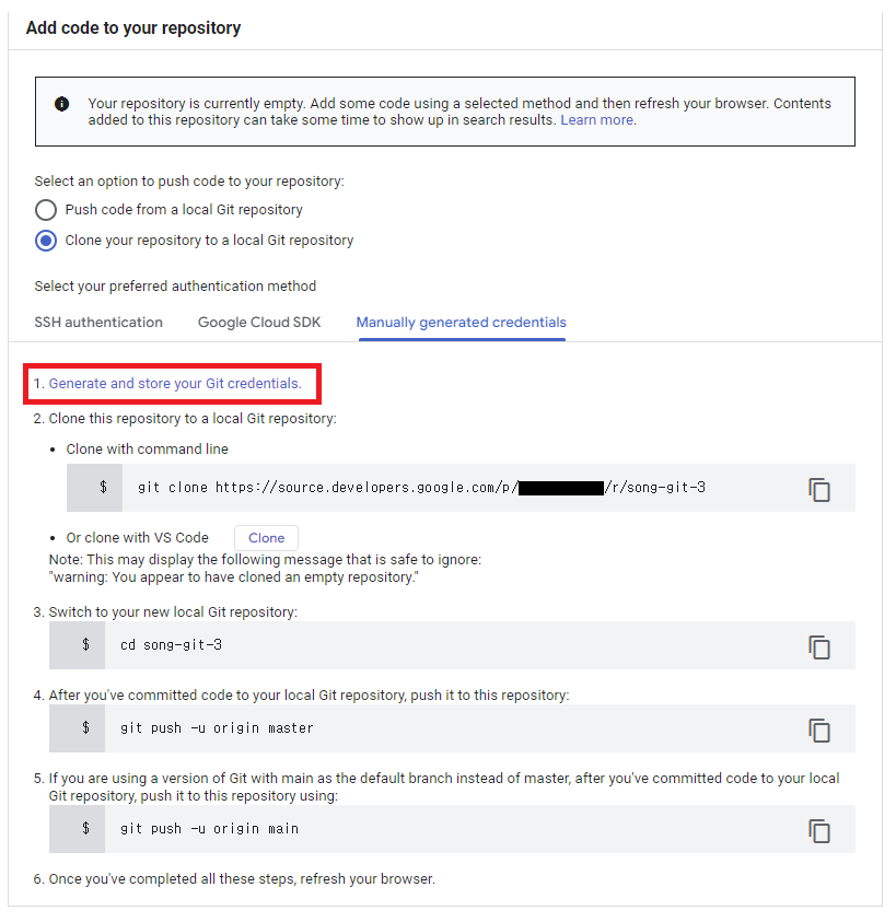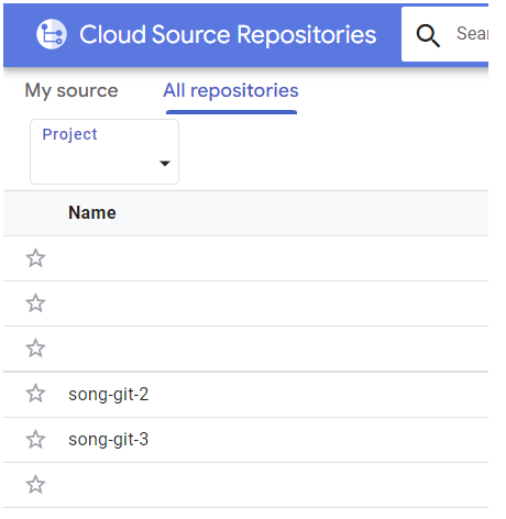 검색창 : source repositories > 리포지토리 확인 > 생성한 리포지토리 클릭('song-git-3') >