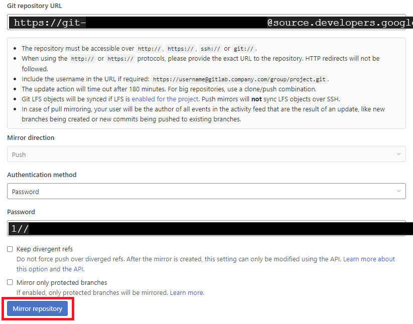 git repository url 입력 > password 입력 > mirror repository 눌러