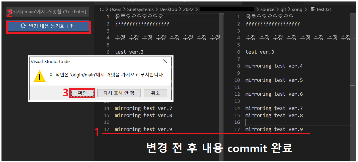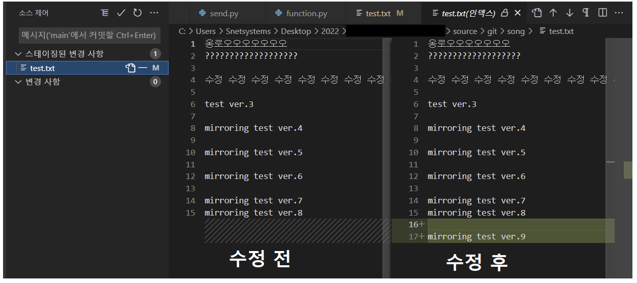 2. commit, push, sync 해도 scr로 연동되지 않음(vscode → git으로는 미러링 완료)