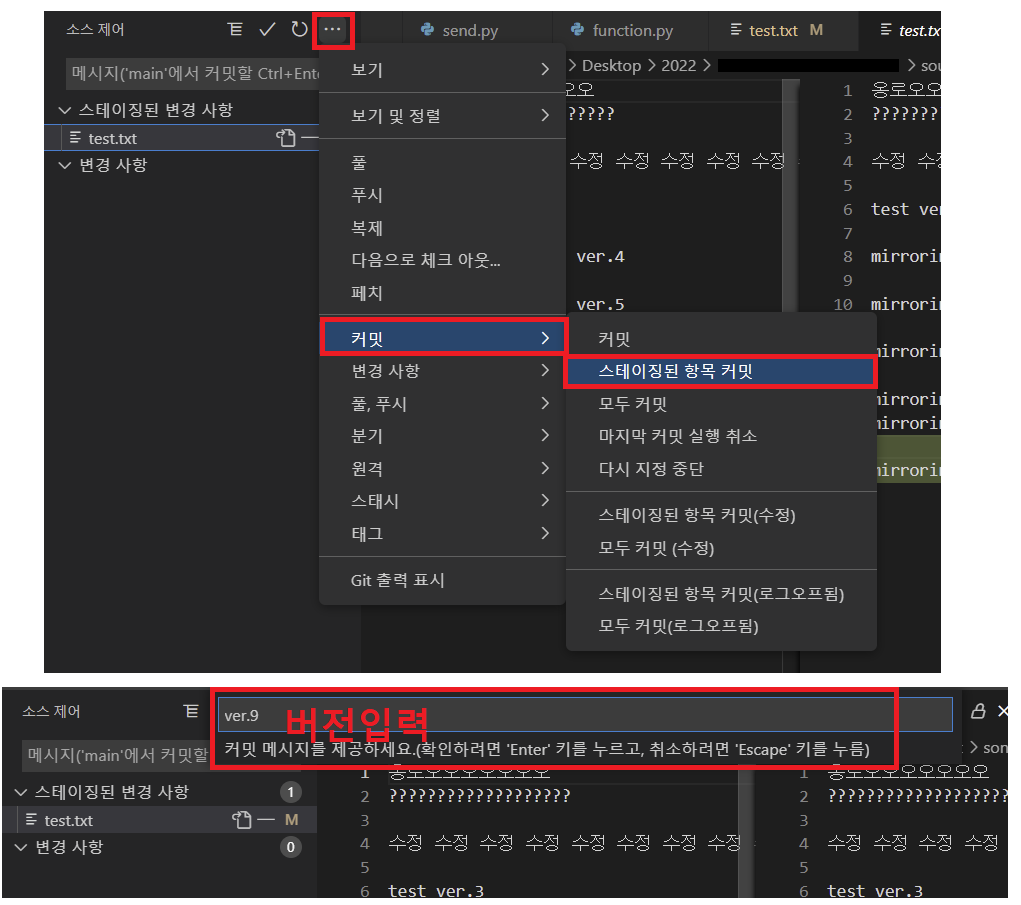 그리고 test 파일을 스테이징 > commit