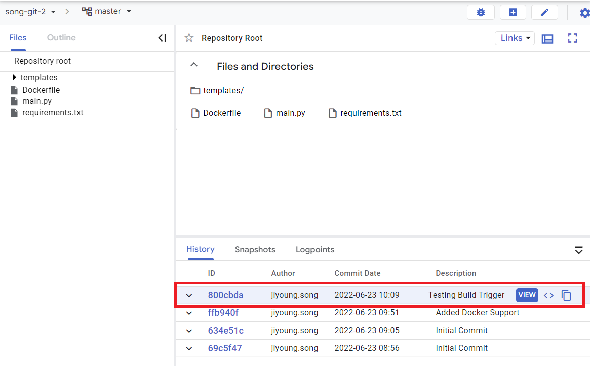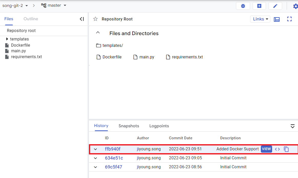 source repositories > Branch > master 파일이 전부 push 되었는지 확인