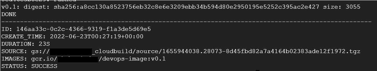 gcloud builds submit --tag gcr.io/$DEVSHELL_PROJECT_ID/devops-image:v0.1 .