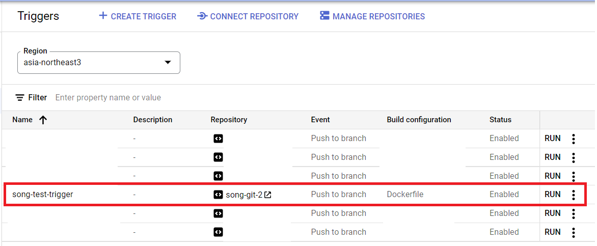 container registry > 'song-git-2' > 새 이미지 확인 > 트리거 기록 보면 빌드가 되었는지 확인