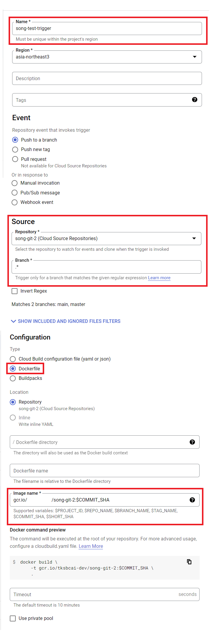 cloud build > triggers > create triggers >