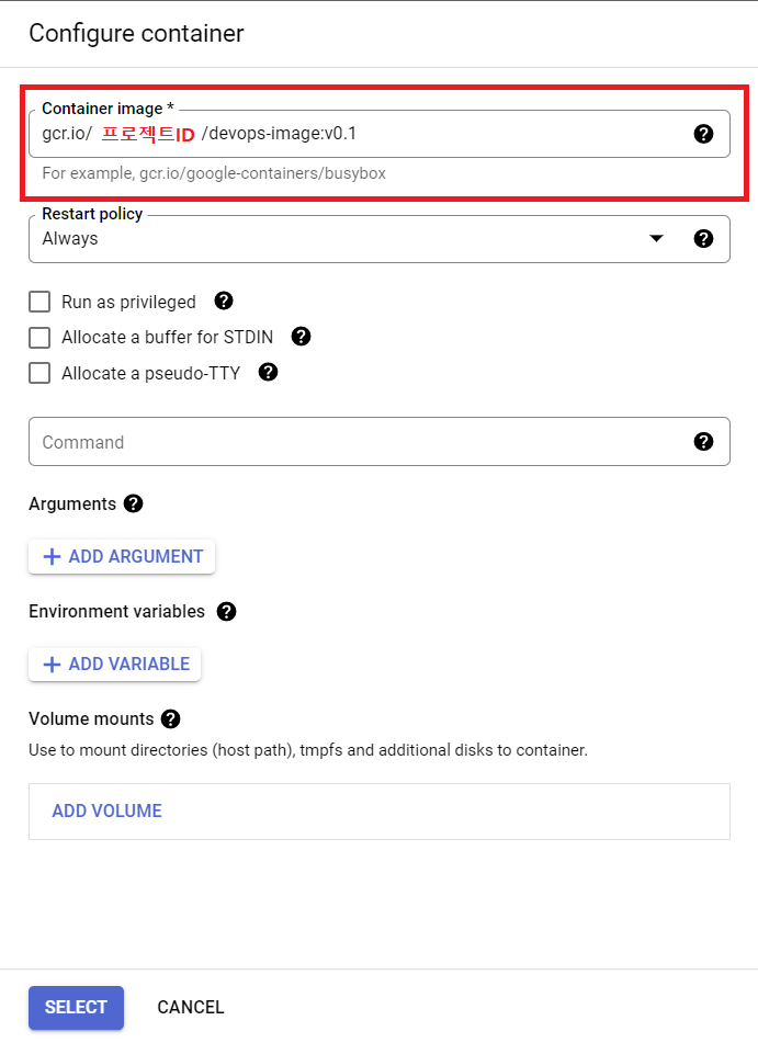 container > container image > select > 설정확인