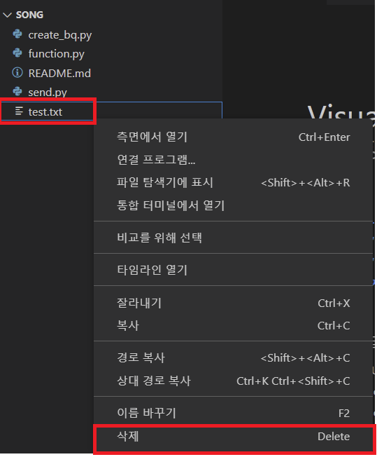 * 마찬가지로 branch가 다르기때문에(폴더에도 영향 없음) 현재 비주얼스튜디오에 있는 test.txt를 지워도 메인 branch의 text.txt는 지워지지 않는다.