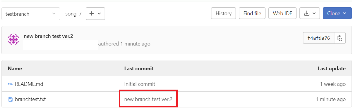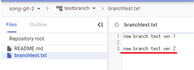 new branch test ver.2가 각각 'last commit' 과 내용에 잘 들어가 있으면 성공이다.