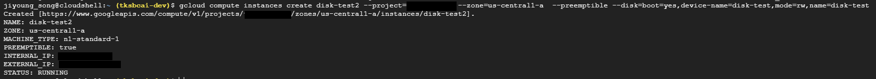 gcloud compute instances create disk-test2[vm명] --project=[프로젝트명] --zone=us-central1-a --preemptible --disk=boot=yes,device-name=disk-test[사용할 disk명],mode=rw,name=disk-test[사용할 disk명]