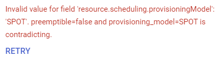 error : Invalid value for field 'resource.scheduling.provisioningModel': 'SPOT'. preemptible=false and provisioning_model=SPOT is contradicting.
