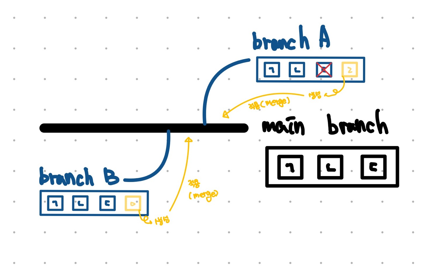 파생된 branch A에 있는 'ㄷ' 파일을 삭제해도 main branch에 있는 'ㄷ' 파일은 지워지지 않는다.
